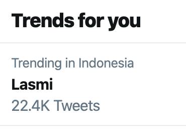 "Lasmi" jadi trending topic di Twitter. Penyebabnya adalah thread horor soal kuntilanak merah penjaga bernama Lasmi yang tinggal di pohon manga daerah Wastukencana, Bandung. Seketika saja keyword Lasmi tembus hingga 22.400 tweets dalam satu jam.