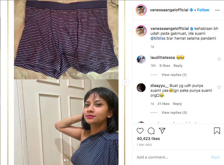 "kehabisan bh (bra) udah pada gak muat. Ide suami @bibliss biar hemat selama pandemi," tulis Vanessa di caption.