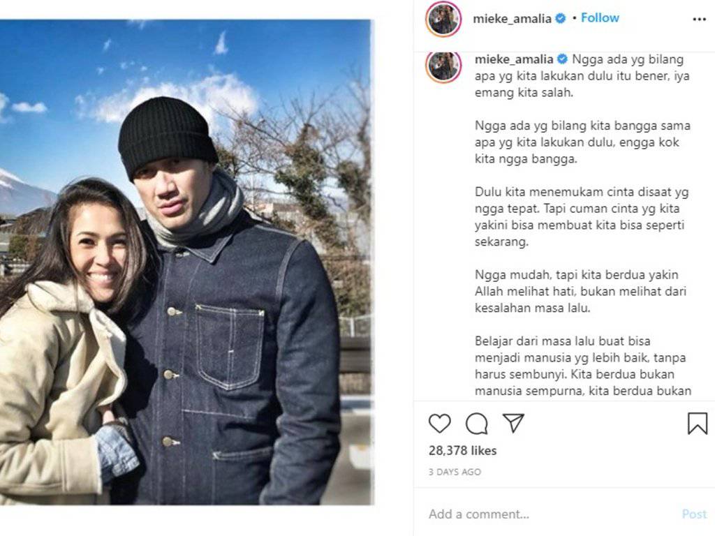“Ngga ada yang bilang apa yang kita lakukan dulu itu bener, iya emang kita salah. Ngga ada yang bilang kita bangga sama apa yang kita lakukan dulu, engga kok kita ngga bangga. Dulu kita menemukan cinta disaat yang ngga tepat,” tulis Mieke Jumat, 23 Oktober 2020, dikutip Tagar, Senin, 26 Oktober 2020.
